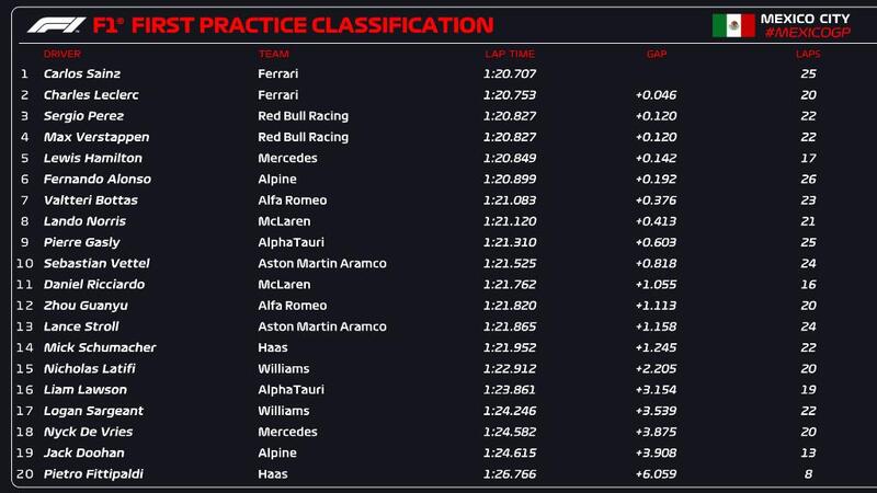 Nelle Libere 1 doppietta della Ferrari, con Carlos Sainz davanti a tutti con il crono di 1.20.707 davanti di 46 millesimi il compagno di squadra Charles Leclerc. All’inseguimento delle Rosse con un distacco di un decimo Sergio Perez, che ha preceduto Max Verstappen e Lewis Hamilton. Sesto Fernando Alonso, alle sue spalle Valtteri Bottas e Lando Norris, completano la top ten Pierre Gasly e Sebastian Vettel.