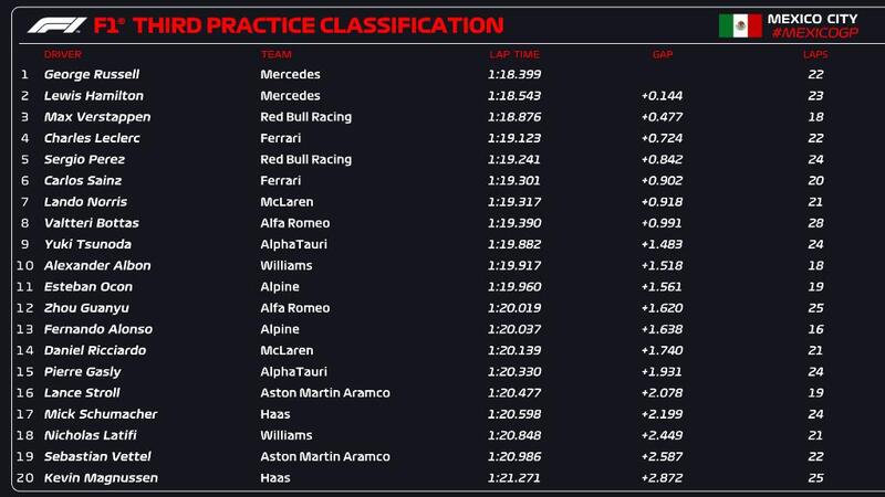 Miglior prestazione di George Russell nella terza sessione di prove libere del Gran Premio del Messico 2022 di Formula 1. L'inglese si è confermato il più veloce precedendo il compagno di squadra Lewis Hamilton che completa l'uno-due della Mercedes, e Max Verstappen. Ferrari all'inseguimento delle due Frecce d'Argento e del campione del mondo, con Charles Leclerc quarto e Carlos Sainz sesto alle spalle di Sergio Perez.