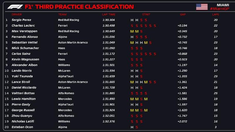 Nell'ultimo turno prima delle qualifiche con pista più lenta di Venerdì, Perez fa tornare a dettare il passo come ad Imola alla Red Bull, confermando il feeling già visto nelle Libere di ieri con il circuito di Miami. Il messicano ha inflitto un distacco di 194 millesimi a Leclerc che fino alla bandiera a scacchi ha provato a togliergli il giro più veloce, facendo il record nel T1 ma poi non rischiando negli altri due settori. Invece Verstappen terzo a tre decimi dal compagno di squadra è andato vicino a finire a muro negli ultimi minuti per stare davanti a Perez, dopo aver cercato di recuperare il tempo perso nelle FP2 facendo il long run.