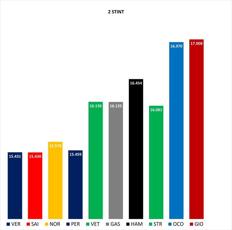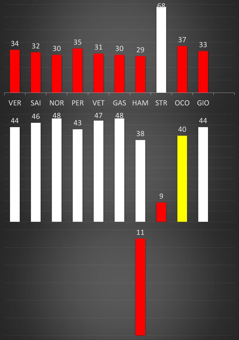 Iniziamo la nostra analisi dalla strategia. Tutti i piloti qualificati alla Q3 hanno fatto il primo stint con le soft e poi passare alle Hard per andare fino in fondo. Unico a fare le due soste Hamilton a cui i meccanici Mercedes hanno montato un secondo treno di gomme rosse per prendere il punto del giro veloce, Invece hard-soft e soft-medie per Stroll e Ocon eliminati in Q2.