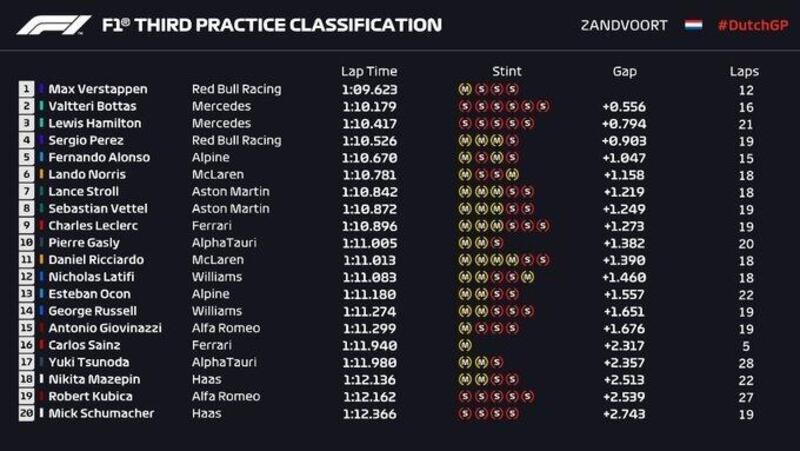 Miglior prestazione per Max Verstappen nella terza sessione del Gran Premio d'Olanda 2021 di Formula 1. 1.09.623 è il crono che ha permesso al pilota della Red Bull di dominare ed infliggere un distacco di mezzo secondo a Valtteri Bottas e otto decimi a Lewis Hamilton.