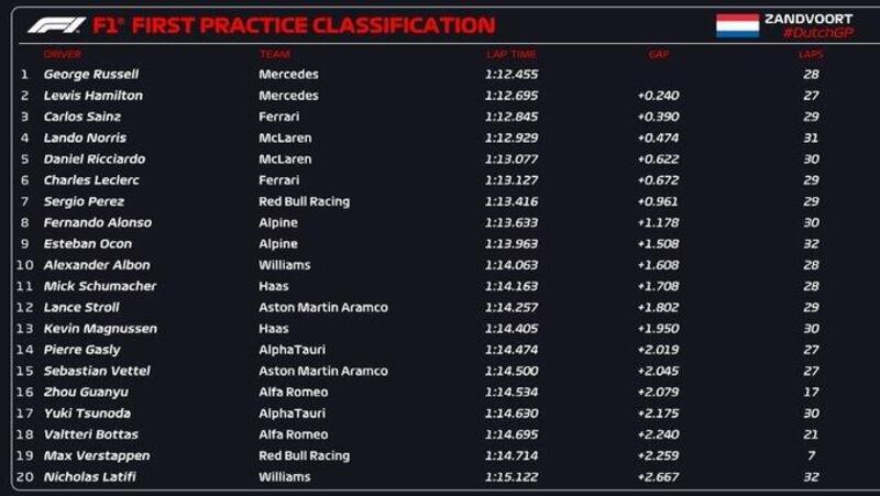 Sorpresa nella prima sessione con l'uno-due della Mercedes. George Russell ha colto il miglior tempo con il crono di 1.12.455, infliggendo un distacco di 240 millesimi al compagno di squadra Lewis Hamilton. Dietro alle due Frecce d'Argento Carlos Sainz, che ha preceduto le McLaren di Lando Norris e Daniel Ricciardo. Sesto Charles Leclerc davanti a Sergio Perez e Fernando Alonso. Completano le prime dieci posizioni Esteban Ocon ed Alexander Albon.