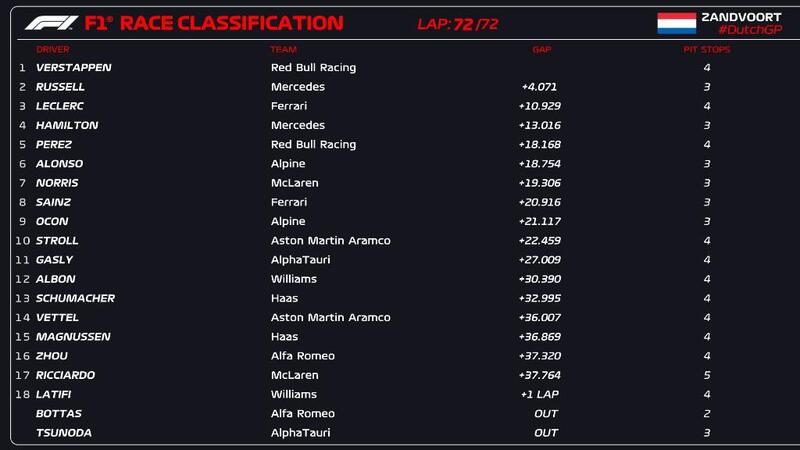 Al 55° giro quando Verstappen sembrava avere la vittoria in pugno la gara si riapre, con Bottas che rallenta in rettilineo a causa di un problema al motore, ed entra in pista la safety car. La Red Bull decide di cambiare le gomme a Verstappen che esce dai box dietro alle due Mercedes, seguito da Leclerc. A sorpresa la stessa mossa la fa Russell, permettendo a Verstappen di salire in seconda posizione, effettuando il pit stop insieme a Sainz che quando esce dai box chiude Ocon, e rischia una penalizzazione. Mossa che si rivelerà sbagliata perchè quando la gara riparte, Verstappen anche senza DRS supera Hamilton e si riprende la prima posizione, seguiti da Russell, Leclerc e Sainz che supera Perez. Verstappen va in fuga, mentre la corsa per Hamilton diventa sempre più in salita, venendo passato prima da Russell e poi da Leclerc. Verstappen nel finale amministra il vantaggio e si gode il boato dei suoi tifosi sulle tribune quando taglia il traguardo, per festeggiare la seconda vittoria di fila nella corsa di casa. Insieme a lui salgono sul podio Russell e Leclerc, alle loro spalle Hamilton, invece Sainz che nelle ultime tornate aveva accompagnato fuori Perez per difendere la posizione, viene penalizzato di cinque secondi per unfease realase scivolando in ottava posizione. Ne approfittano Perez quinto, Alonso sesto, e Norris settimo, completano la zona punti Ocon e Stroll. Fuori dalla top ten Gasly, Albon, Schumacher che non è riuscito a confermarsi sui livelli delle qualifiche. L'ordine d'arrivo del Gran Premio d'Olanda è chiuso da Vettel, Magnussen, Zhou e Ricciardo soltanto diciassettesimo e Latifi.