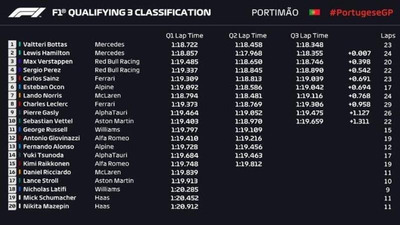 Bottas per soli sette millessimi ha impedito di stabilire la 100 pole position della carriera a Hamilton, che ha provato come l'anno scorso a fare il secondo tentativo con le medie ma questa volta l'azzardo non ha pagato e si deve accontentare di far occupare tutta la prima fila alla Mercedes che ha dato una grande prova di forza dopo le difficoltà del Bahrain. Infatti l'altro grande battuto di giornata è Max Verstappen che ha accusato un distacco di quattro decimi da Bottas, e non ha mai dato la sensazione a differenza di Sakhir e Imola di poter contrastare il Team di Brackley. Al suo fianco partirà Sergio Perez che pur non ripetendo le prove ufficiali del Gp dell'Emilia Romagna ottiene un buon quarto posto.