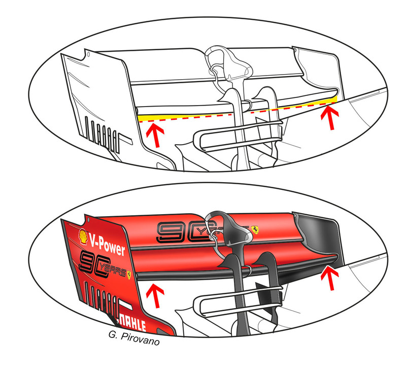 Novità tecniche in casa Ferrari per il Gran Premio di Russia 2019 di Formula 1: a Sochi la Rossa ha portato due diverse tipologie di ala posteriore. Oltre alla versione standard con il flap principale lineare è stata portata e provata anche la versione a “cucchiaio” con il flap principale sollevato alle estremità esterne.