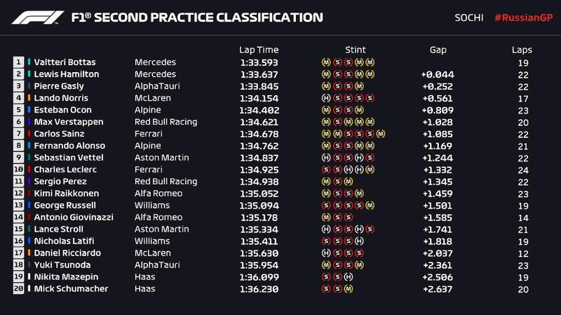All'inseguimento delle Mercedes Pierre Gasly, Lando Norris che ha ricandidato la McLaren al ruolo di outsider anche in Russia, ed Esteban Ocon. Dietro al francese Max Verstappen che anche se Domenica è prevista pioggia ha lavorato soltanto per la gara non cercando la prestazione, facendo un'ottima simulazione.