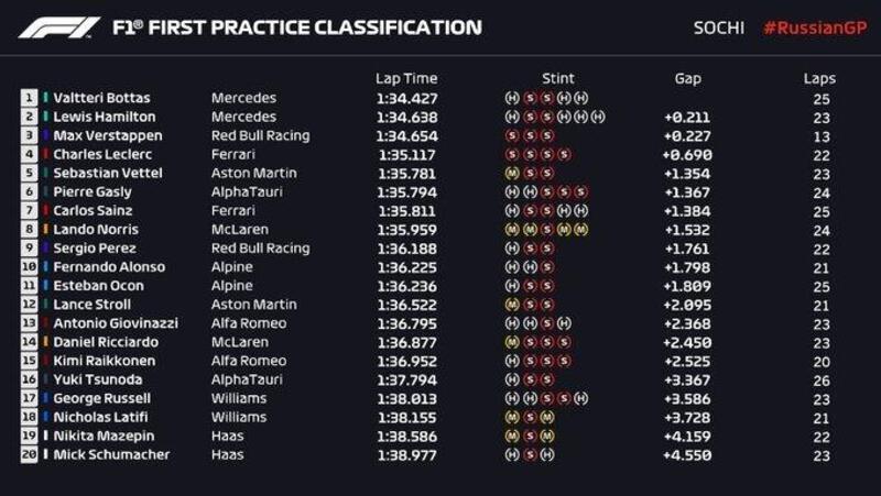 Nelle FP1 uno-due della Mercedes, Valtteri Bottas con il crono di 1.34.427 aveva fatto la miglior prestazione davanti di due decimi a Lewis Hamilton. Stesso distacco per Max Verstappen, che precede Charles Leclerc il quale ha dato risposte positive alla Ferrari sulla nuova power unit e Sebastian Vettel.