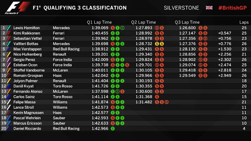 Non sorride l’altro pilota di casa in Inghilterra, Jolyon Palmer: ancora una volta il confronto con Hulkenberg, quarto nella Q2, è impietoso. Seguono Daniil Kvyat, della Toro Rosso, e Fernando Alonso, della McLaren Alonso si è tolto la soddisfazione di cogliere il miglior tempo nella Q1 con le supersoft: un risultato, questo, che ha generato un boato da parte dell’esperto pubblico di Silverstone.