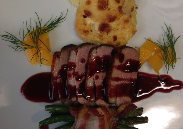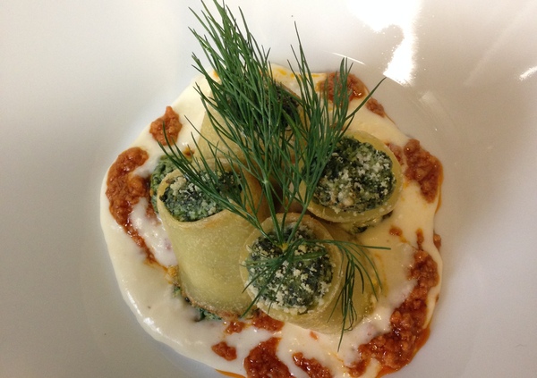 Baby melanzane ripiene di formaggio di capra,asparagi bianchi e olio al prezzemolo, paccheri ripieni di spinaci e ricotta con besciamella e ragù e per finire anatra confit all'arancia, gratin di patate e salsa al vino rosso.