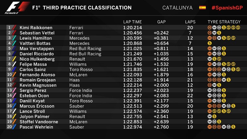 Miglior prestazione per Kimi Raikkonen nella terza sessione di prove libere del Gran Premio di Spagna: 1'20"214 è il crono del pilota finlandese, ottenuto con pneumatici soft. La Ferrari ha messo a segno una doppietta nelle FP3: Sebastian Vettel, infatti, è secondo, a poco più di due decimi dal compagno di squadra. A trecento millesimi da Vettel troviamo Lewis Hamilton, che ha preceduto l'altro alfiere della Mercedes, Valtteri Bottas. La SF70H, dopo qualche difficoltà nella giornata di ieri, oggi è apparsa più competitiva. La sfida tra Ferrari e Mercedes si preannuncia serrata.