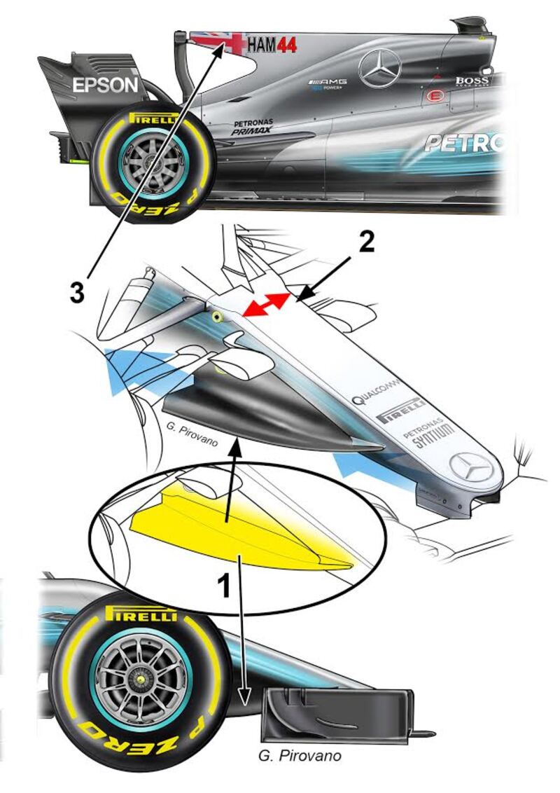 Per quanto riguarda la Mercedes, sulla W08 debuttano dei nuovi deviatori ai lati del muso (1), che si estendono da sotto il telaio sin quasi alla punta dell'anteriore, creano una sorta di diffusore per incanalare aria sotto la vettura e creare più deportanza. Si tratta di una soluzione totalmente inedita.
