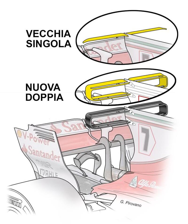 Il musetto (2) è più stretto rispetto a quello vecchio, dalla punta alla zona dell'attacco al telaio. È nuova anche la pinna sopra il cofano motore (3), che è più lunga verso il posteriore e si attacca alla T-wing a diapason. Modifiche anche ai deviatori laterali con nuove appendici aerodinamiche; inedito l’alettone posteriore, non più a cucchiaio ma con flap lineari e rettilinei.