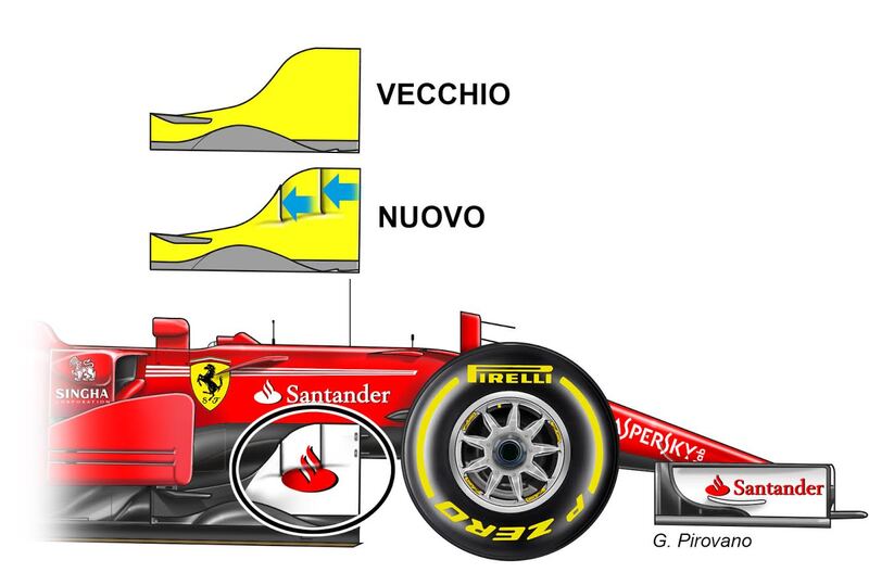 In casa Ferrari, la SF70H presenta una nuova T- wing - ala posta sul finire della pinna sopra il cofano - a diapason con doppi elementi in stile Mercedes. I deviatori laterali davanti alle pance vantano due nuove soffiature verticali.
