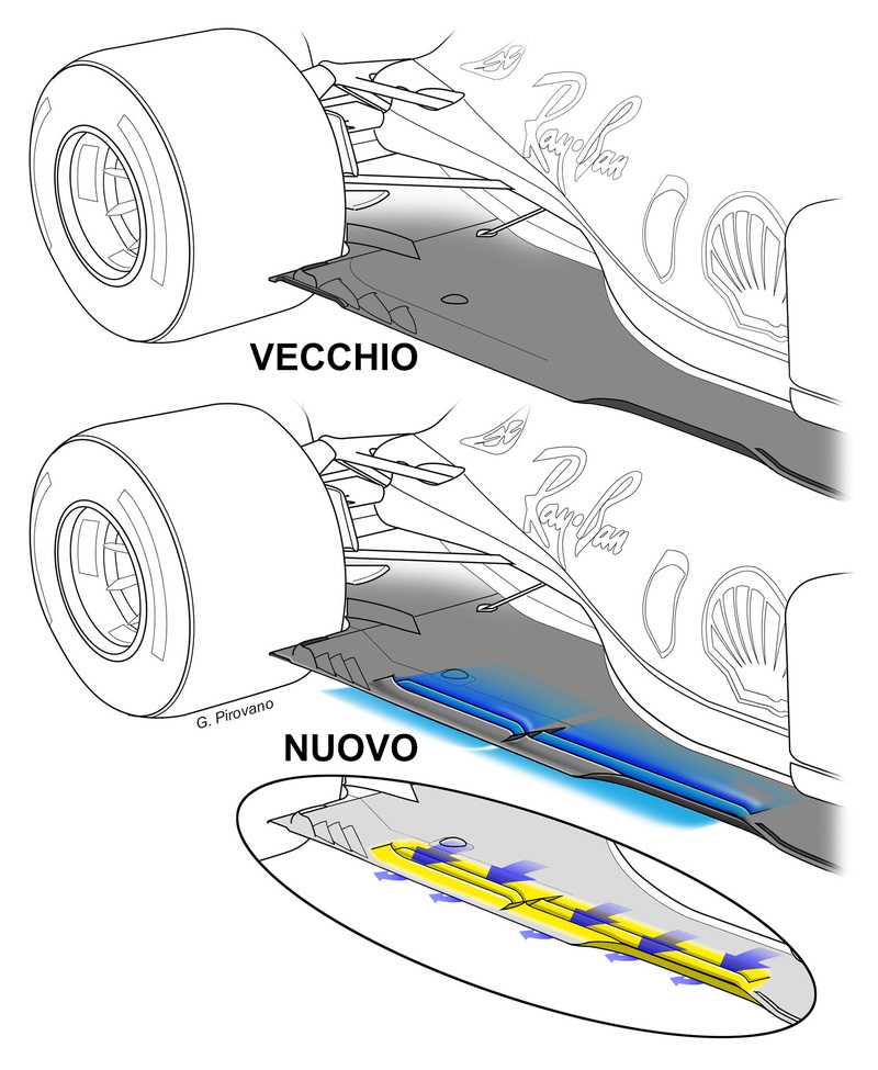 Queste feritoie servono per incanalare più aria verso il fondo vettura e quindi in direzione dell’estrattore posteriore per generare maggior deportanza.