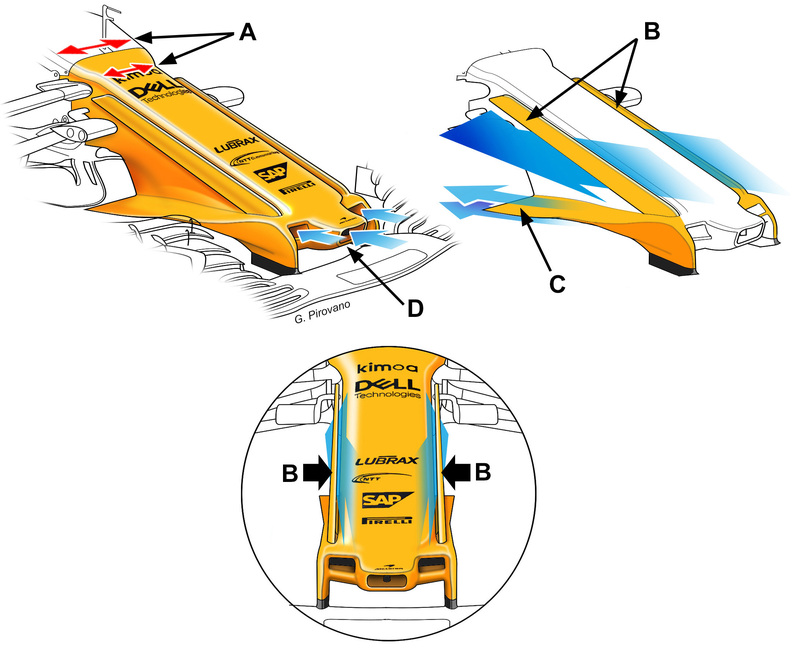 Il Circuit de Catalunya, viste le sue caratteristiche miste, è il banco di prova ideale di nuove soluzioni: per questo motivo, il GP di Spagna è spesso scelto dai team per apportare degli aggiornamenti aerodinamici. È il caso della McLaren, che a Montmelò porta un inedito ed innovativo muso, che presenta due lunghe pinne che scorrono ai suoi lati.