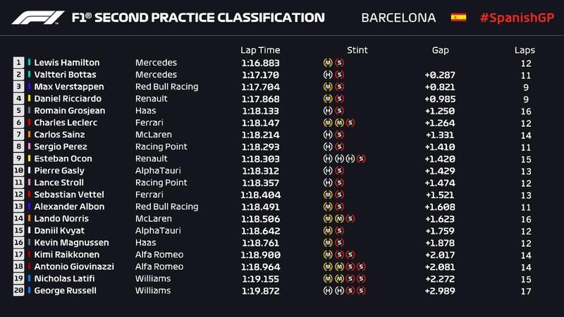 Miglior prestazione per Lewis Hamilton nella seconda sessione di prove libere del Gran Premio di Spagna 2020 di Formula 1 a Barcellona. 1'16"883 è il crono colto dall'inglese. Hamilton ha preceduto il compagno di squadra Valtteri Bottas, al top nelle FP1 di stamani, e l'olandese della Red Bull, Max Verstappen. Montmelò non è certo terreno inesplorato per il Circus, ma per la prima volta i piloti si trovano ad affrontare la pista teatro dei test invernali a Ferragosto, e non nella tradizionale collocazione di maggio. E il clima è decisamente caliente, come direbbero i locali: la temperatura dell'asfalto nelle FP2 ha superato i 50 gradi.