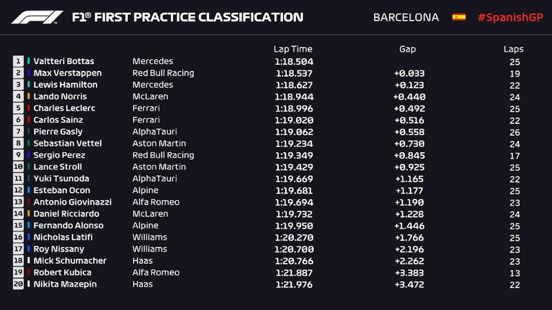 Al Montmelò il week end è iniziato come si era concluso quello di Portimao, con Hamilton davanti a tutti. Infatti l'inglese ha risposto infliggendogli un distacco di 139 millesimi a Bottas (1.18.309) il più veloce nelle Fp1, con la Mercedes che ribadisce di essere tornata la macchina degli anni scorsi piazzando subito una doppietta, e volando anche nella simulazione del passo gara.