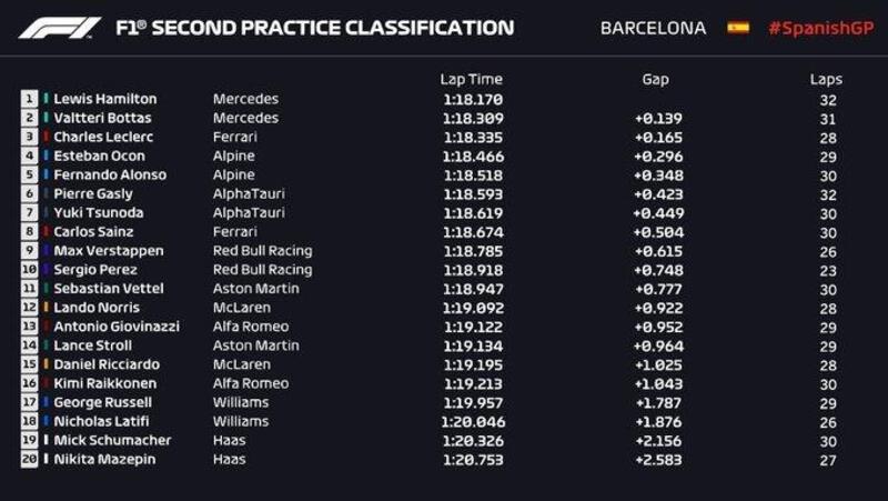 Miglior prestazione per Lewis Hamilton nella seconda sessione di prove libere del Gran Premio di Spagna 2021 di Formula 1. 1.18.170 è il crono fatto segnare dal leader del mondiale precedendo Valtteri Bottas e Charles Leclerc.