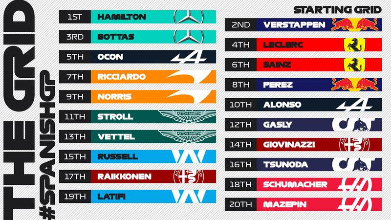 Undicesima posizione per l’Aston Martin di Lance Stroll, mentre Pierre Gasly scatterà dodicesimo. Tredicesimo Sebastian Vettel, seguono Antonio Giovinazzi, George Russell e Yuki Tsunoda dell’Alpha Tauri. Completano lo schieramento Kimi Raikkonen dell’Alfa Romeo, e Mick Schumacher della Haas; Nicholas Latifi della Williams, Nikita Mazepin.