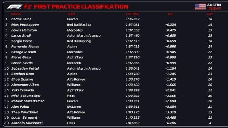 Nelle FP1 il più veloce è stato Carlos Sainz con il crono di 1.36.857, infliggendo un distacco di due decimi a Max Verstappen, e mezzo secondo a Lewis Hamilton. Quarto Lance Stroll davanti a Sergio Perez, Fernando Alonso, e George Russell. Completano la top ten Pierre Gasly, Lando Norris e Sebastian Vettel.