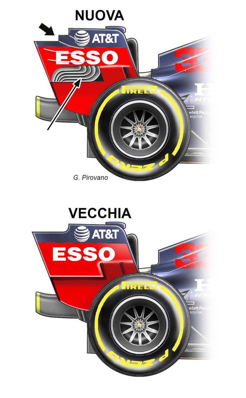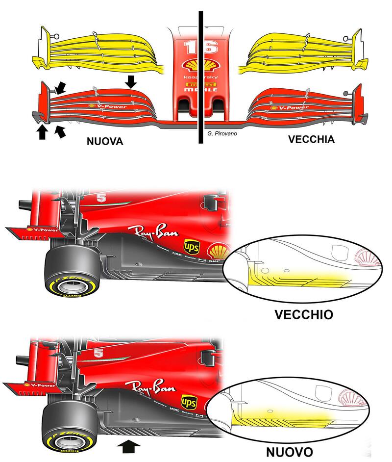 Nessuna novità tecnica per la Mercedes per il Gran Premio di Stiria 2020 di Formula 1. La Ferrari, invece, ha portato novità aerodinamiche che non hanno dato grandi risultati. Anche la Red Bull ha portato una soluzione, che però ha funzionato bene. In casa Ferrari debutta una nuova ala anteriore. Sono completamente nuovi tutti i flap, quello principale e i 4 sovrastanti. Quello principale presenta un diverso disegno nella zona esterna, mentre gli altri flap hanno disegno e forma più morbida e una curvatura più costante ed omogenea.