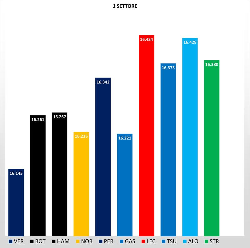 Perez a differenza di Verstappen e Gasly non sfrutta la superiorità del motore Honda, Leclerc paga la scelta della Ferrari di caricare la SF21, facendo l'ultimo intermedio nel T1.