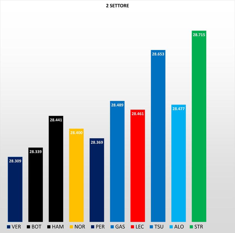Verstappen fa il record anche nel secondo settore, ma a sorpresa viste le difficoltà delle prove libere è Bottas l'unico a tenergli testa, guadagnando un decimo ad un Hamilton lontano dai livelli delle Fp3 e più lento anche di Norris e Perez. Leclerc e Alonso con il loro migliore settore, provano a tornare in corsa per la seconda e terza fila.