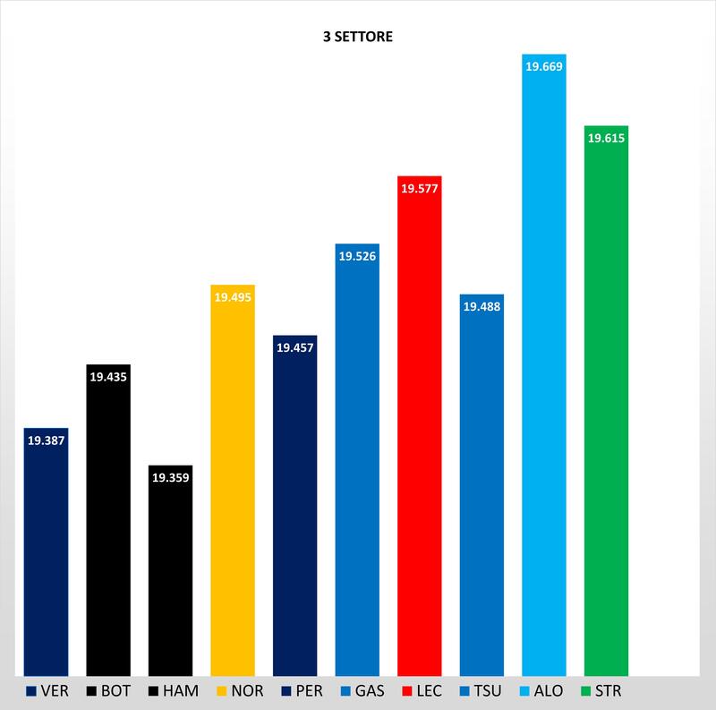 Norris fa la differenza anche nell'ultima parte di pista e per 48 millesimi batte Perez, Leclerc più lento delle due Alpha Tauri, sia perché rispetto alle PL2 non riesce a migliorare nel T3, che per non aver potuto effettuare il secondo tentativo con una soft nuova, si deve accontentare della 7° posizione.
