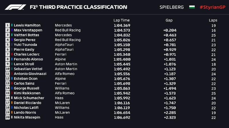 Miglior prestazione di Lewis Hamilton nella terza sessione di prove libere del Gran Premio di Stiria di Formula 1. 1.04.369 è il crono con cui il pilota della Mercedes ha preceduto Max Verstappen, Valtteri Bottas e Sergio Perez. Si candidano a sorpresa delle qualifiche le Alpha Tauri di Yuki Tsunoda 5° e Pierre Gasly 6° davanti a Charles Leclerc 7°, soltanto 13° Carlos Sainz.