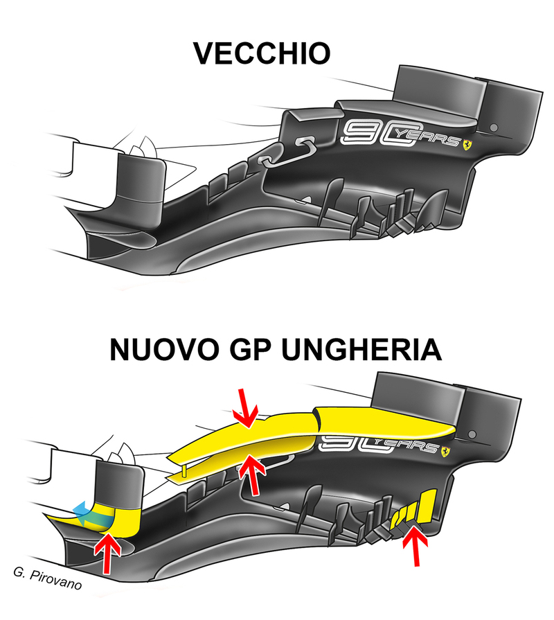 In questo modo, diventano una sorta di doppio boomerang, che indirizza l’aria verso le bocche dei radiatori e crea maggior deportanza. In Ungheria la Ferrari introduce anche delle piccole pinnette verticali posti sul fondo all’inizio dei deviatori e una soffiatura inedita nella zona finale della pinna verticale che si allaccia alla serie che avvolge la pancia.