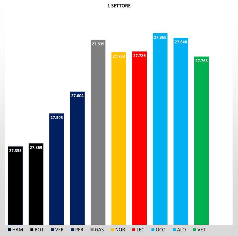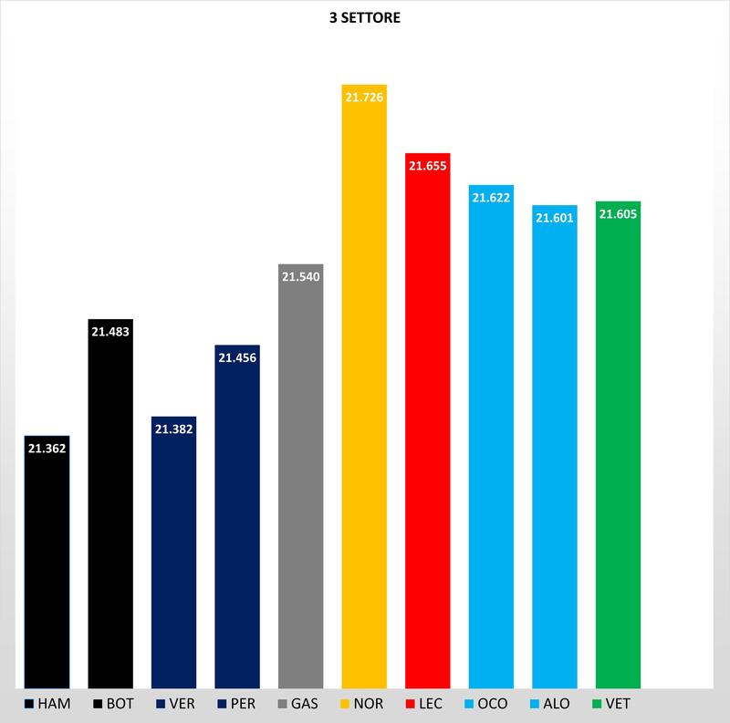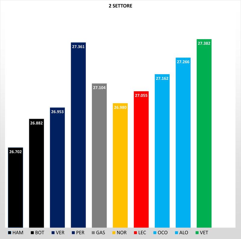 Hamilton facendo la differenza nella parte centrale e guadagnando due decimi a Bottas, mette al sicuro la pole, mentre Verstappen conferma di non avere il feeling con la Red Bull delle ultime gare, perdendo terreno dalle Mercedes anche nel 2° settore. Norris, e Leclerc che nel T2 recuperno a tre decimi a Perez, provano a tornare in lotta per la seconda fila.