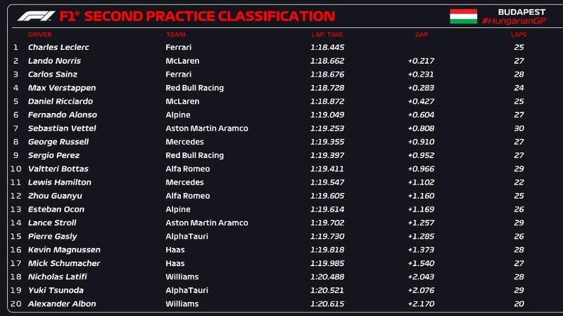 Miglior prestazione di Charles Leclerc nella seconda sessione di prove libere del Gran Premio d'Ungheria 2022 di Formula 1. 1.18.445 è il crono che ha permesso al monegasco di precedere la McLaren di Lando Norris ed il compagno di squadra Carlos Sainz. Dietro allo spagnolo Max Verstappen, mentre continuano le difficoltà con la RB18 di Sergio Perez nono. Attardate anche le Mercedes, con George Russell ottavo e Lewis Hamilton undicesimo.