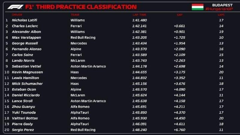 Miglior prestazione di Nicholas Latifi nella terza sessione di prove libere del Gran Premio d'Ungheria 2022 di Formula 1. Il canadese ha riportato la Williams in prima posizione, precedendo Charles Leclerc ed il compagno di squadra Alexander Albon. Quarto come nelle FP2 Max Verstappen davanti a George Russell, settimo Carlos Sainz che non ha voluto prendere rischi nel finale. Pochi giri per Lewis Hamilton undicesimo, e Sergio Perez ventesimo.