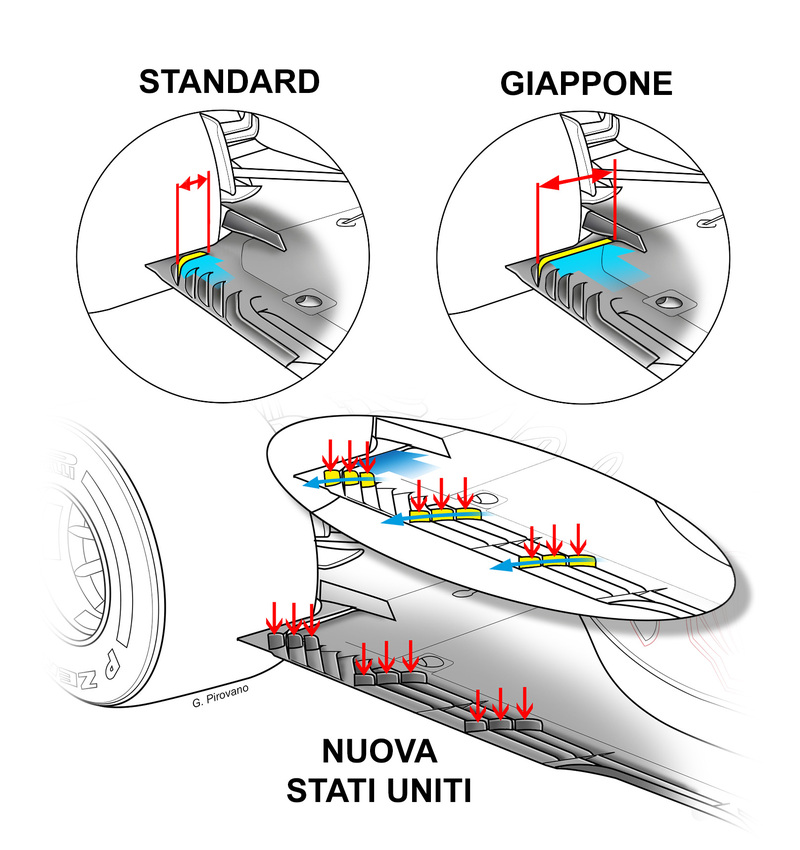 In Giappone era stato provato ma poi scartato per la gara un fondo con il taglio slot finale a ridosso delle ruote posteriori che era stato allargato rispetto alla versione standard più corto (vedi disegno in alto). Questo perché i residui di gomma che si staccavano dagli pneumatici andavano ad ostruire il nuovo slot più largo.