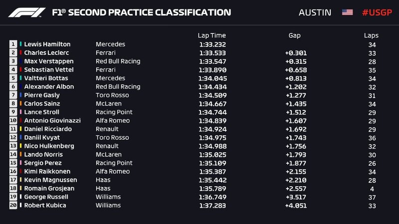Miglior prestazione per Lewis Hamilton nella seconda sessione di prove libere del Gran Premio degli Stati Uniti, terzultimo appuntamento della stagione 2019 di Formula 1. 1'32"232 è il crono colto dall'inglese della Mercedes, che ha preceduto il monegasco della Ferrari, Charles Leclerc, e Max Verstappen, in forza alla Red Bull. Quarta posizione per l'altro pilota della Rossa, Sebastian Vettel, protagonista di un testacoda a fine sessione; segue Valtteri Bottas, in forza alla Mercedes. La scuderia di Brackley ha mostrato un passo gara convincente, specie con Hamilton.
