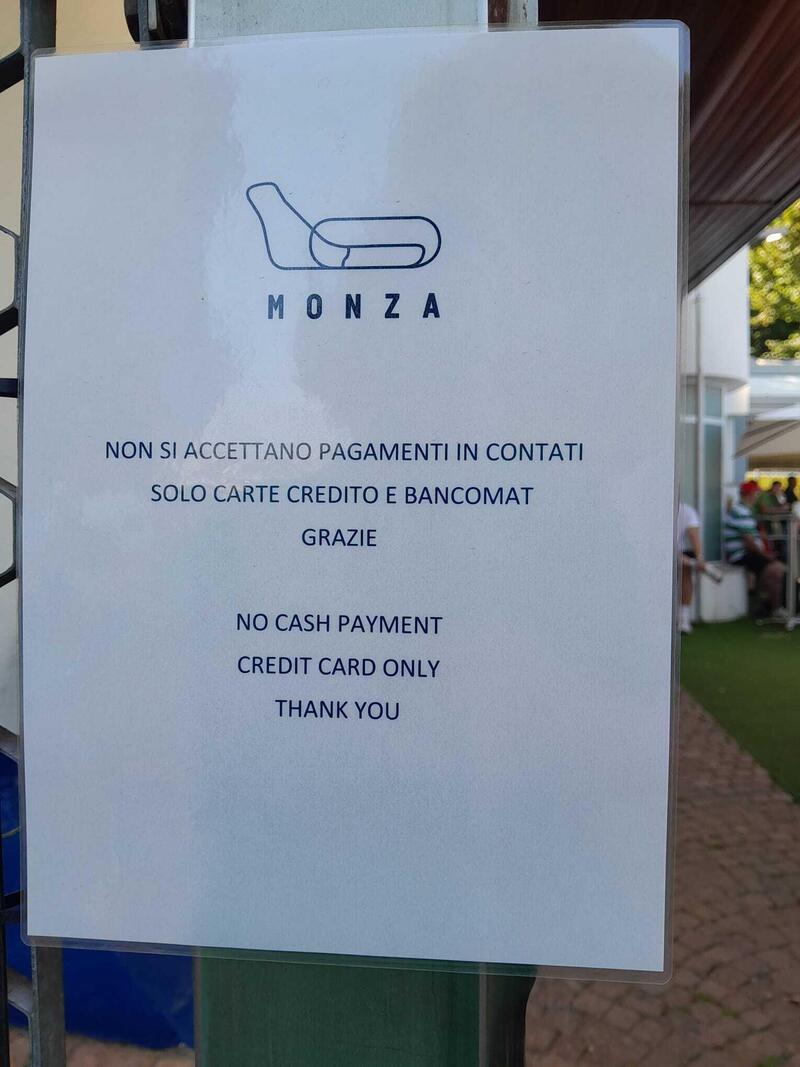 All’interno del circuito c’è finalmente un bar aperto al pubblico, ma il problema era che vietavano il pagamento in contanti ma solo carte di credito. A parte l’errore nel poster all’ingresso (contati invece di contanti…) molti sono rimasti spiazzati, ma a quanto pare tutti i pagamenti devono essere tracciati. Con somma felicità della Guardia di Finanza che aveva uno stand alla Fan Zone. Avranno pagato con carta di credito o era gratis? Boh… Ridiamoci sopra.
