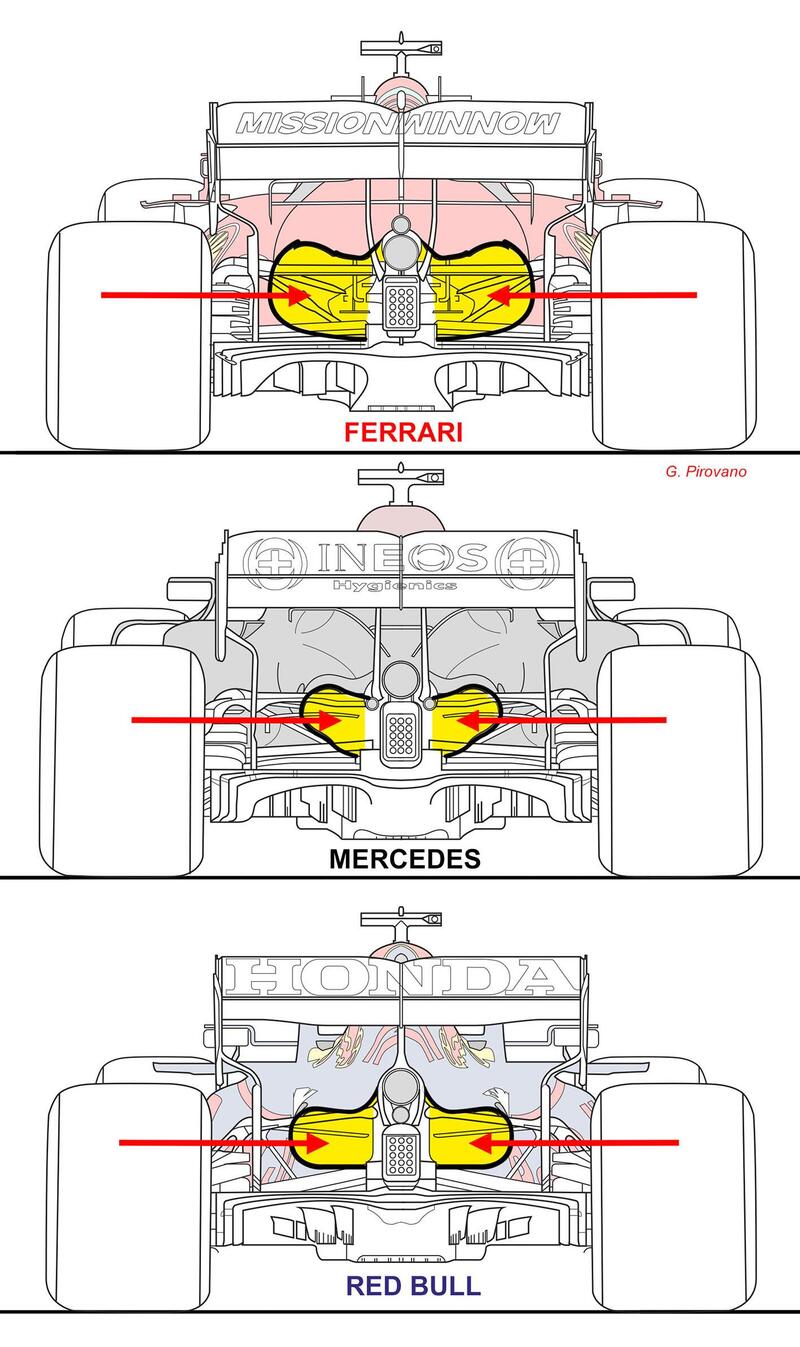 Ecco, invece, le aree in cui la Ferrari non è potuta intervenire. La prima è il muso. Come Williams e Haas, la Ferrari adotta ancora un muso largo, mentre tutti gli altri hanno un muso stretto che migliora in fatto di penetrazione aerodinamica. Ma la Ferrari non ha potuto modificarlo perchè i bonus gettoni sono stati spesi per modificare la zona posteriore della vettura. La seconda è lo smaltimento del calore. La Ferrari patisce ancora il caldo. Nei test si sono viste aperture in fondo alle pance per smaltire il calore dai radiatori e motore di dimensioni notevoli (le più grandi in assoluto rispetto ai rivali). Si tratta di un handicap cronico, che costringe da anni la Rossa a sfoghi maggiorati, a discapito della penetrazione aerodinamica. I miglioramenti, però, sono stati notevoli. Abbastanza da far supporre un mondiale migliore rispetto al 2020.