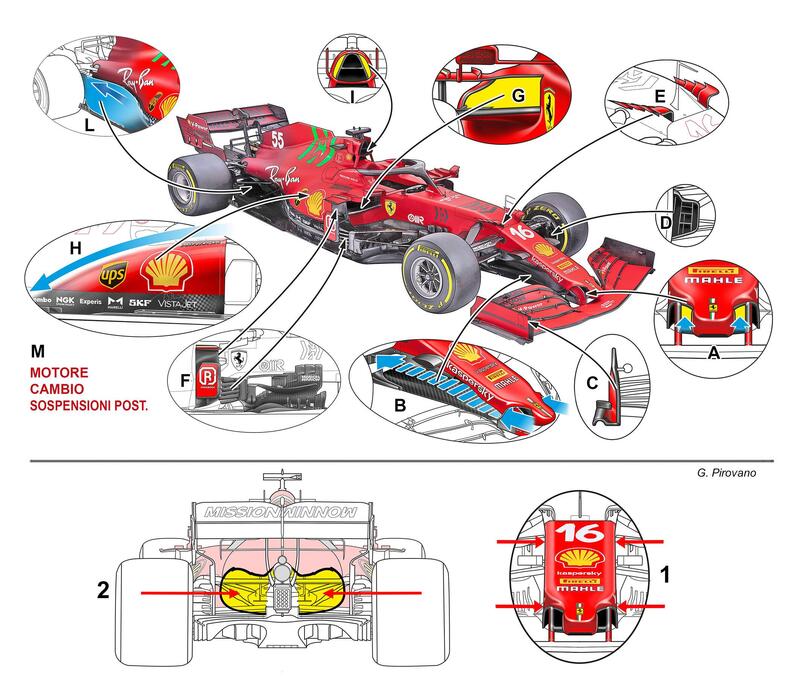Le pance (H) sono molto diverse dalle precedenti, scendono in maniera molto più accentuata al posteriore come su tutte le altre monoposto. Una soluzione, questa, pensata per migliorare i flussi aria che vanno verso il posteriore e sullo scivolo posteriore. La presa d'aria del motore (I) è più larga, con nuove orecchie ai lati per dare più aria ai componenti della power unit. Cambia profondamente il posteriore (L), con la zona attorno al cambio molto più stretta. Grazie alla nuova trasmissione è maggiore la portata d'aria sopra lo scivolo posteriore, a tutto vantaggio aerodinamico. Motore, cambio e sospensioni posteriori (M) sono inediti e garantiranno più potenza e stabilità al posteriore.