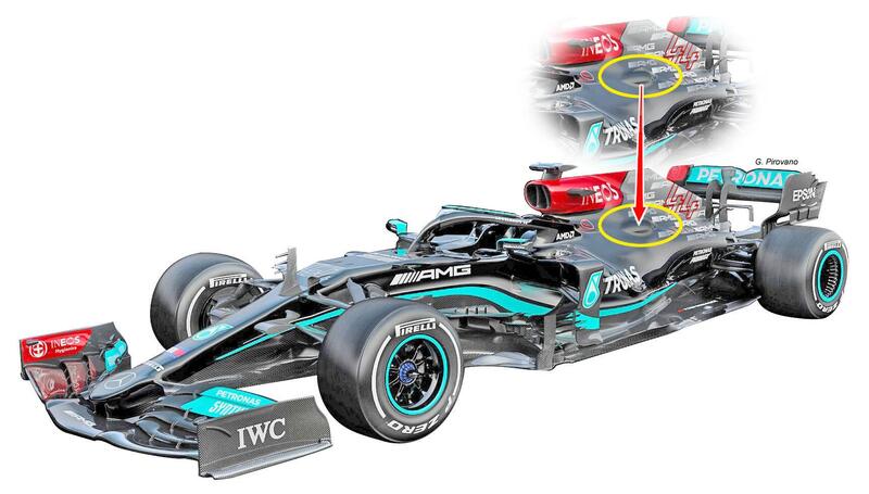 Rigonfiamento che non esisteva sulla vettura 2020. Segno che i grossi cambiamenti ci sono sotto la carrozzeria proprio attorno al motore. Probabilmente parte degli organi della power unit sono stati riposizionati e rivisti. Anche in questa zona il cofano sembra più rastremato verso l’interno. Se la nuova W12 sembra un clone della W11 a livello aerodinamico sicuramente gli sviluppi si sono concentrati sul motore.