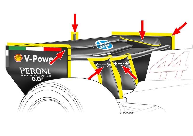 Dalle immagini trapelate dal filming day organizzato dalla scuderia di Milton Keynes si notano alcuni dettagli interessanti, a cominciare da una soluzione di ispirazione Ferrari. L’ormai famigerata ala Macarena, con quella rotazione a 270° che ha fatto girare la testa agli avversari nei test in Bahrain, era sicuramente nella mente dei progettisti guidati dal direttore tecnico Pierre Waché nel momento in cui è stata concepita una nuova ala posteriore con flap rotanti.