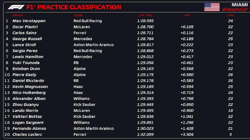 Il team di Maranello, in pista solamente con Sainz, si è concentrato sulla preparazione del giro secco, senza occuparsi della simulazione passo gara, lasciando il punto interrogativo sulle prestazioni della Rossa sulla pista di Miami fino alla giornata di domani, quando si disputerà la Sprint da 100 km. Il miglior tempo è stato siglato dalla Red Bull di Max Verstappen con un 1:28.595 sul cronometro. Alle spalle del sette volte campione del mondo si è piazzato Oscar Piastri, precedendo Carlos Sainz. Quarto tempo per George Russell seguito da Lance Stroll, Sergio Perez e Lewis Hamilton. In un fazzoletto di solamente mezzo secondo si trovano i primi dieci che si completano con Yuki Tsunoda, Esteban Ocon e Pierre Gasly. Undicesimo tempo per Daniel Ricciardo, seguito da Kevin Magnussen, Nico Hulkenberg, Alexander Albon, Zhou Guanyu, Lando Norris, Valtteri Bottas, Logan Sargeant e Fernando Alonso. Ultimo Charles Leclerc che non ha avuto modo neanche di chiudere il suo primo tentativo.