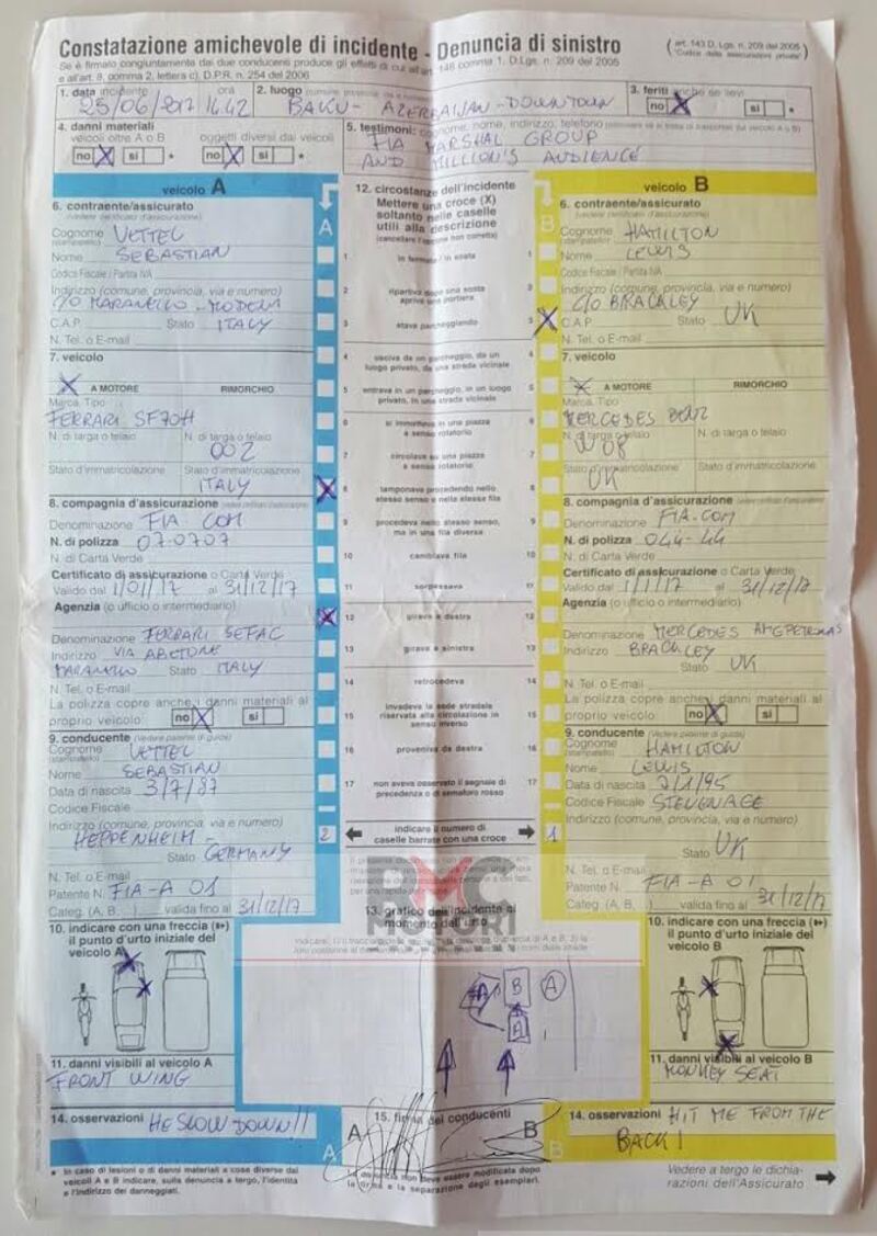 A conclusione della diatriba seguente alla tamponata di Sebastian Vettel a Lewis Hamilton nel recente GP di Azerbaijan, siamo entrati in possesso di un documento segreto che vi proponiamo in esclusiva. Si tratta del verbale di accordo firmato da Vettel ed Hamilton dopo i rilievi del caso. Una fonte segreta della federazione ci ha fatto pervenire il documento, che vi mostriamo in anteprima ed esclusiva mondiale. A seguito di questa clamorosa rivelazione i due piloti (e le squadre) hanno rifiutato qualsiasi commento in merito, quello che emerge è solo un dato certo: in F.1 manca la voglia di scherzare ed ogni cosa diventa tremendamente seria.
