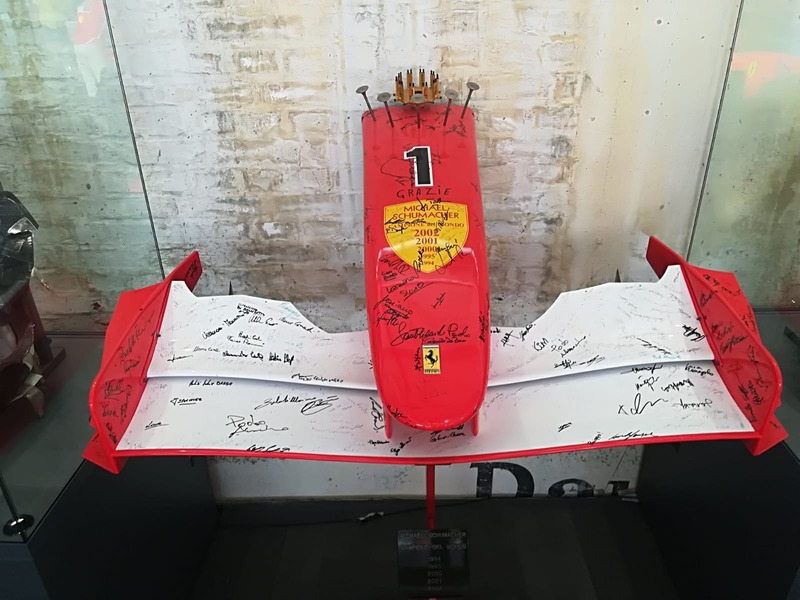 Una collezione unica con tutti i suoi cimeli nei quali si racconta la sua incredibile carriera. In teche di vetro sono esposti i guanti, i caschi, le tute, addirittura i pass indossati da Michael nella sua carriera di pilota di F.1, e poi ancora i kart, la sua prima F.3, nonché la Benetton con la quale vinse il suo primo titolo nel 1994, e poi le Ferrari… Non mancava assolutamente nulla. Che dire dei bellissimi video esclusivi? Senza pudore si può dire che la commozione sia facile assalitrice con quelle sensazioni di un passato ancora ben presente nella mente di tutti. Alcuni hanno sospeso la visione dei filmanti per non far trasparire la commozione al pensiero di cosa sia oggi Michael e in che condizioni versi. E' un viaggio nell'anima, che colpisce nel profondo gli appassionati e non. Il Ferrari Club Caprino ringrazia di vero cuore la Dott.ssa Sabine ed il Direttore per la loro grande disponibilità ed il riguardo avuto nei confronti degli ospiti. Un piccolo pezzo di questo museo, su precisa richiesta dello staff (Giulio Carissimi in testa) è stato fatto dono di uno dei Banner che fanno da contorno alla Mostra, il quale sarà appeso nella sede di Caprino Bergamasco, a testimonianza della partecipazione.