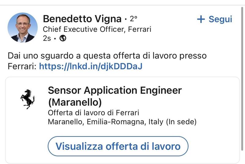 Il clima di forte incertezza evidente da una serie di indiscrezioni riguardo alle ultime defezioni dalla GES della Ferrari e ulteriori possibili addii ha talmente alzato la soglia di attenzione dei tifosi del Cavallino in Formula 1 da far diventare un semplice annuncio di lavoro su Linkedin un caso sui social. Due settimane fa - ma evidentemente questa attività è passata inosservata finora - il CEO di Ferrari, Benedetto Vigna, ha postato sulla piattaforma dedicata alle offerte di lavoro un'effettiva proposta. La Ferrari, si legge, cerca un Senior Application Engineer. Apriti cielo: sui social è partita la corsa al commento al vetriolo, con una buona dose di ironia. La Ferrari è talmente in difficoltà - parafrasiamo - da avere necessità di cercare sostituti ai partenti direttamente su Linkedin.