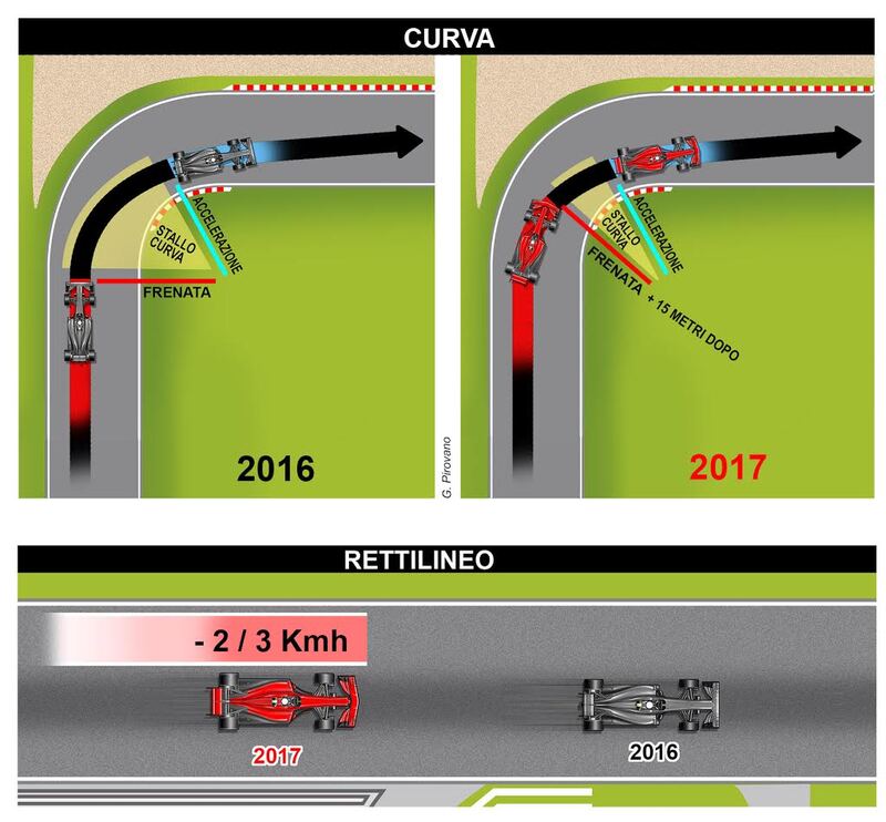 Un altro esempio viene dal Bahrain, nel settore T2, quello tutto curve, il tempo di percorrenza si è ridotto di quasi cinque decimi, eppure la velocità in uscita era da paura: l'anno scorso Hamilton era transitato a 275 all'ora contro i 269 del 2015. Nell'edizione appena disputata Hamilton è uscito dalla curva a 281 km/h, ovvero in un anno e con le nuove regole aerodinamiche ha guadagnato 6 km/h in uscita di curva e ne ha persi 4 in pieno rettilineo. Questo per far capire come vanno le macchine 2017.