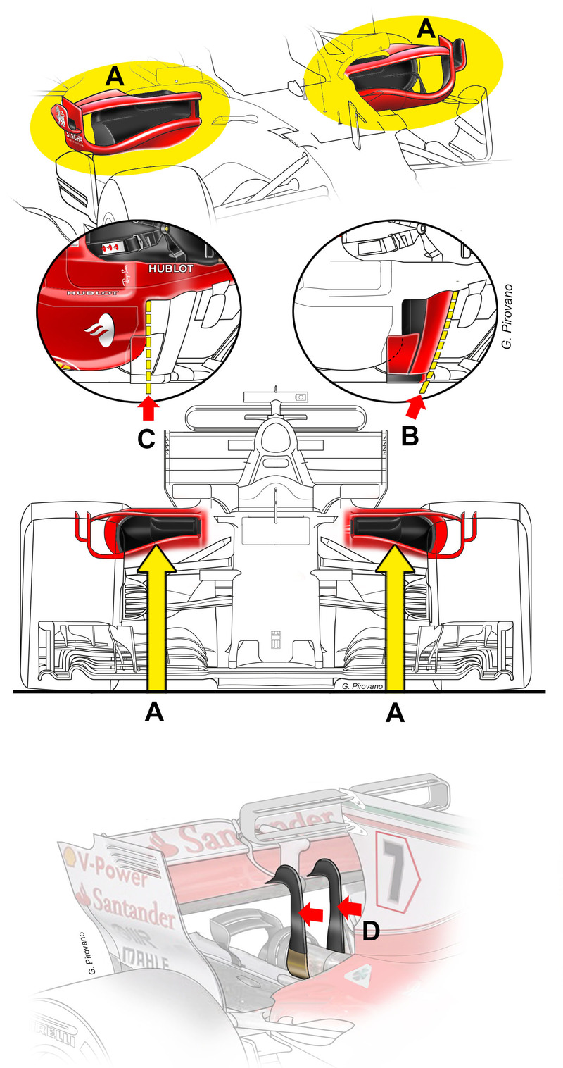 L’halo, inoltre, avrà un influsso negativo sull’efficienza aerodinamica delle monoposto: i team hanno sviluppato delle soluzioni per mitigarne, almeno in parte, l’effetto deleterio sulla performance del propulsore e sull’efficacia dell’ala posteriore, canalizzando meglio i flussi, per quanto concesso dal regolamento tecnico.