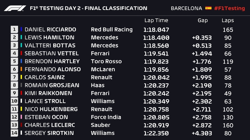 Proseguono i test pre-stagione di Formula 1 in quel di Barcellona: nella sesta giornata di prove ad imporsi sulla concorrenza è stato Daniel Ricciardo. 1'18"047 è il crono colto dall'australiano della Red Bull, che ha preceduto i due piloti della Mercedes, Lewis Hamilton e Valtteri Bottas, staccati di tre e quattro decimi, rispettivamente. Per la cronaca, Ricciardo ha ottenuto il suo miglior tempo - e il nuovo record della pista in questa configurazione - con pneumatici hypersoft; Hamilton e Bottas, invece, con le ultrasoft.