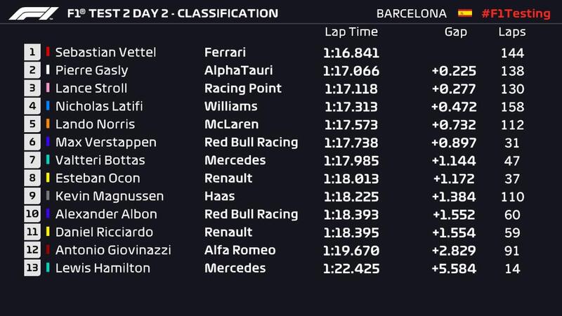 Per la prima volta dall'inizio dei test pre-stagionali di Formula 1 a Barcellona, una Ferrari si installa al primo posto della classifica: Sebastian Vettel ha ottenuto il miglior tempo oggi. 1'16"841 è il tempo colto dal tedesco della Rossa utilizzando la mescola più prestazionale tra quelle pensate da Pirelli per la F1, C5. Vettel in mattinata è stato protagonista di un testacoda in curva 5, causando un regime di bandiera rossa per rimuovere i detriti lasciati in pista.