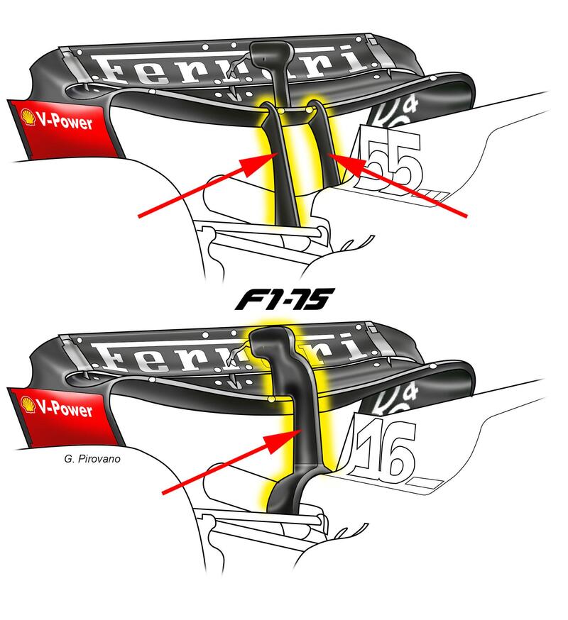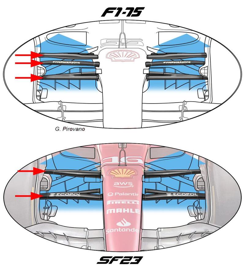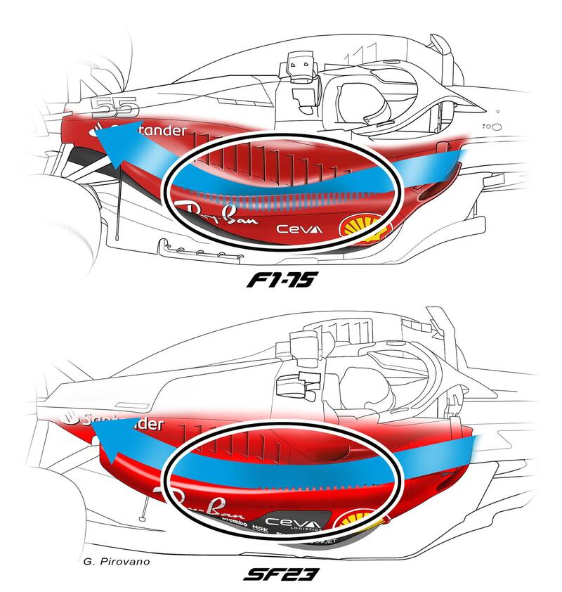 Ma dove è intervenuta la Ferrari per raggiungere questo scopo? I tecnici hanno lavorato sulle pance, snellite soprattutto nella zona iniziale inferiore che ha uno scavo più profondo, ma ristrette anche nella zona posteriore vicino al fondo. Soluzioni, queste, che garantiscono una minor resistenza all'avanzamento. Resta l'incavo delle pance visto lo scorso anno sulla F1-75, ma la scavatura è meno profonda rispetto allo scorso anno nella zona centrale. Le pance risultano così più lineari, creando un flusso aria al posteriore che indirizza meno aria sotto l'ala posteriore a vantaggio di meno resistenza all'avanzamento.