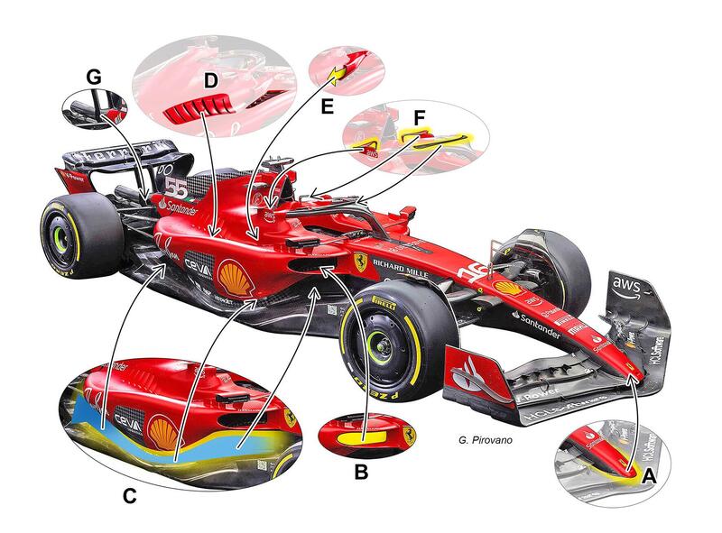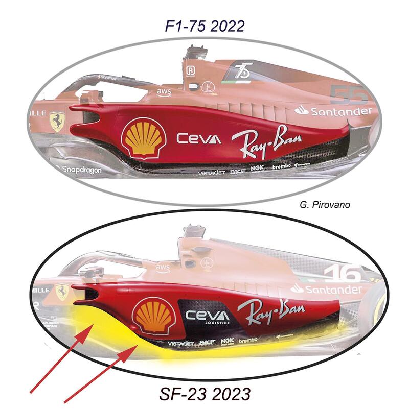 Sulla SF-23 non è presente il piccolo e lungo scarico della valvola wastegate (G) che la scorsa stagione era posizionato sopra lo scarico principale, segno che è stata ridisposta la conformazione degli scarichi motore. Si notano poi altre piccole modifiche alla pinna del cofano motore, che ora ha un volume minore. I radiatori sono leggermente più piccoli, mentre la meccanica delle sospensioni è stata mantenuta identica a quella del 2022. Nel secondo disegno si nota come siano state snellite le pance soprattutto nella zona inferiore, il tutto a vantaggio aerodinamico per cercare di ovviare al problema di resistenza aerodinamica che portava con sé il disegno della F1-75, rendendola meno efficace in rettilineo.